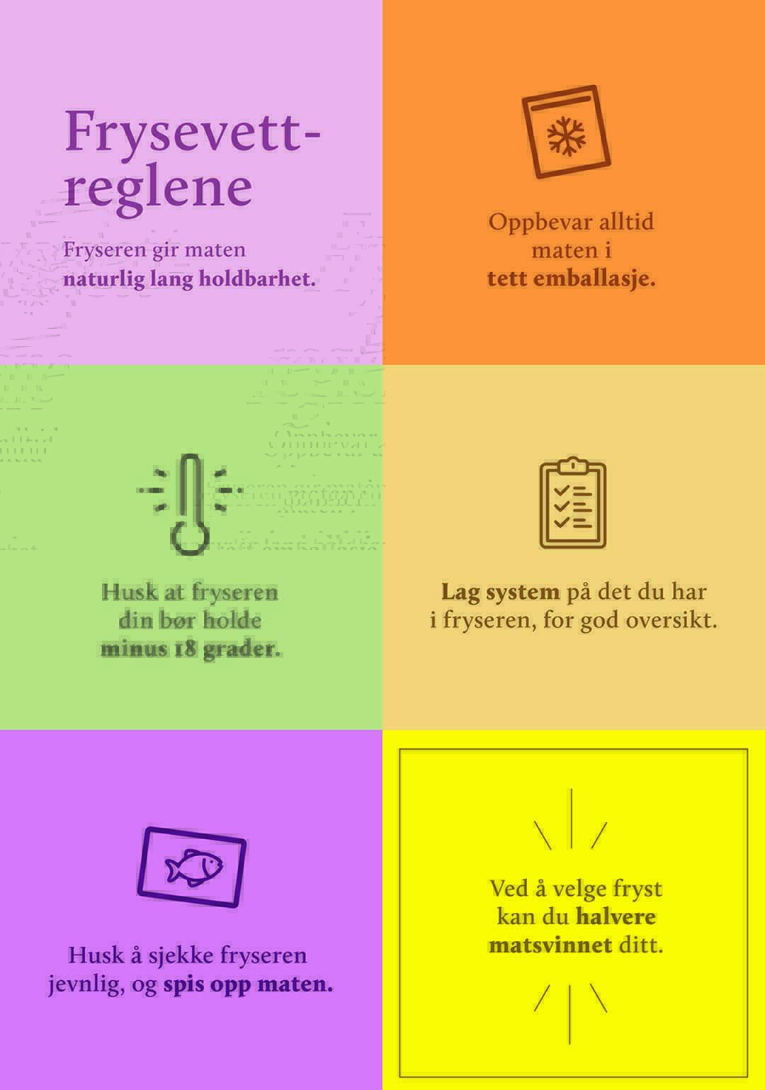 Fryseren er en helt naturlig måte å ta vare på maten på, og gir maten lang holdbarhet. Husk å bruke den aktivt i matplanleggingen! Bruk frysevettreglene i hverdagen, så kan du både spare penger ved å utnytte maten bedre, og redusere matsvinn. Tips til bruk av fryseren og frysing av ulik mat finner du ved å lese videre.